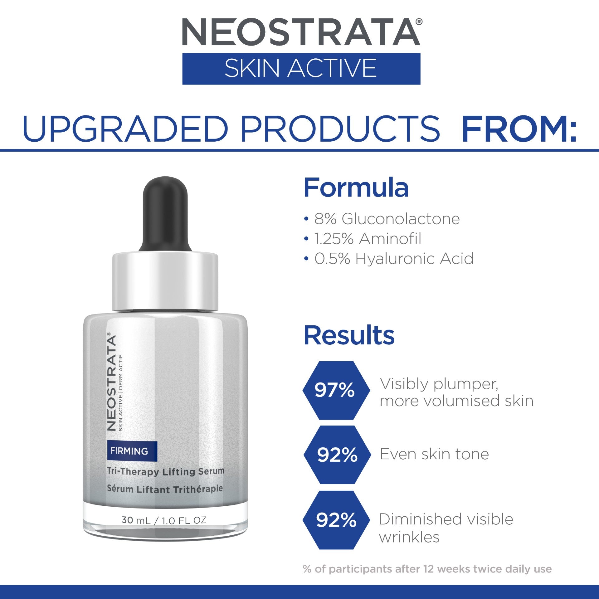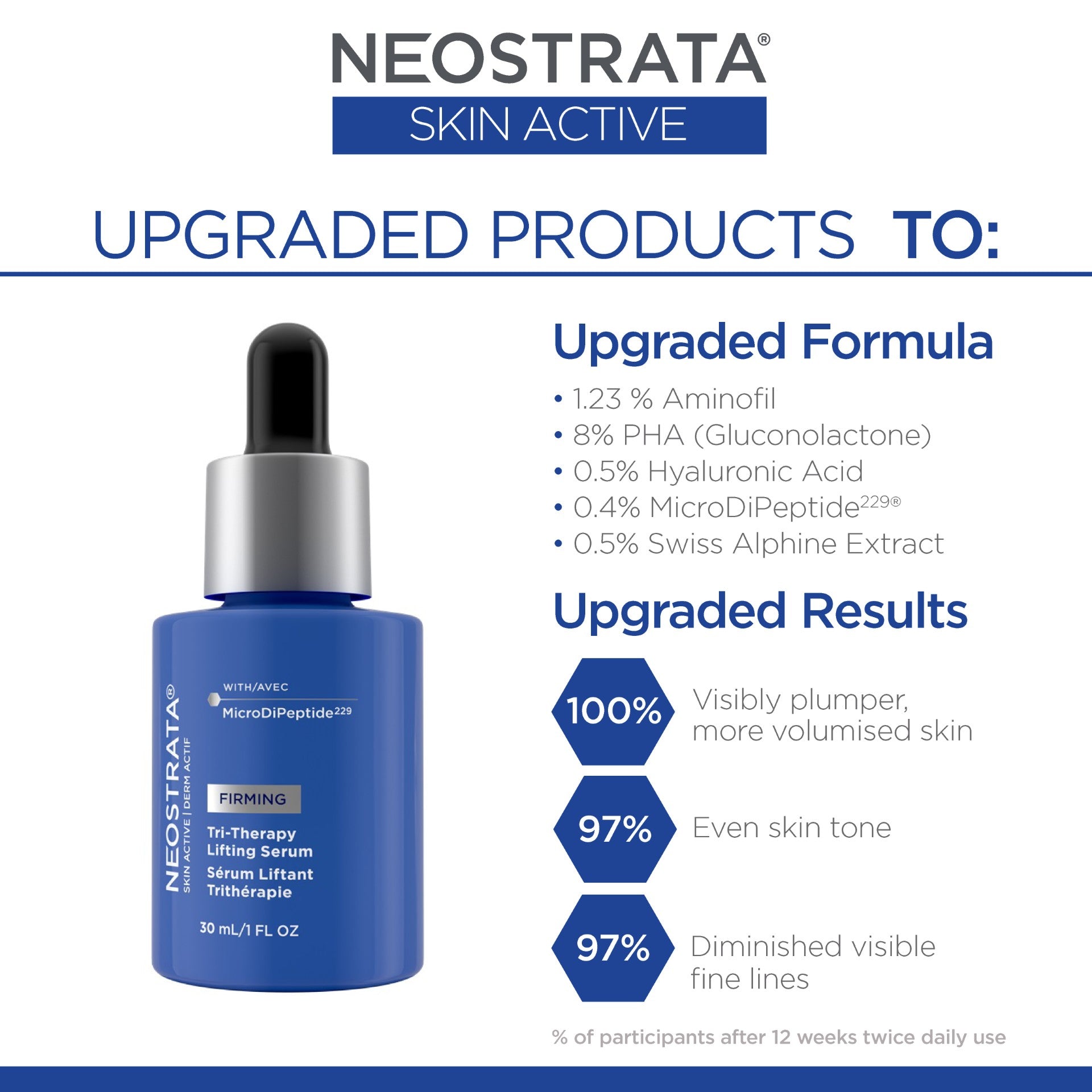 Target fine lines and wrinkles in just 1 week* with NEOSTRATA’s most powerful anti-ageing serum now featuring breakthrough MicroDiPeptide229® - our patented lifting and firming peptide technology, 2.5x times smaller than other leading cosmetic peptides allowing for optimised delivery into skin’s surface –plus a new formula of Gluconolactone, Aminofil, Hyaluronic Acid and Alpine Plant Extract Complex for an intensely renewed, firmer look. This potent firming formula visibly volumises, hydrates, and brightens for triple the amount of therapy in one serum. Tested on all skin tones. Fragrance-free.